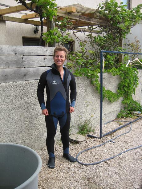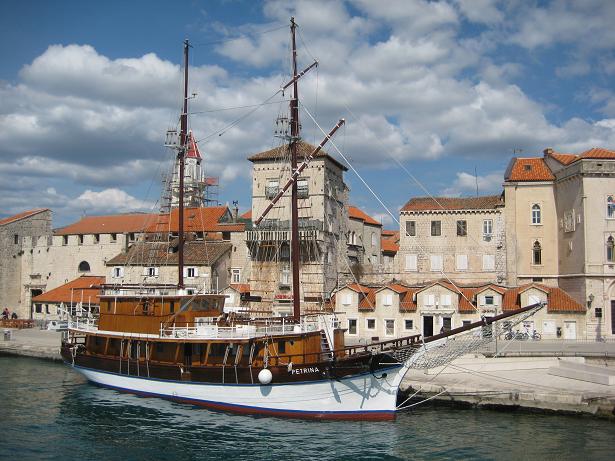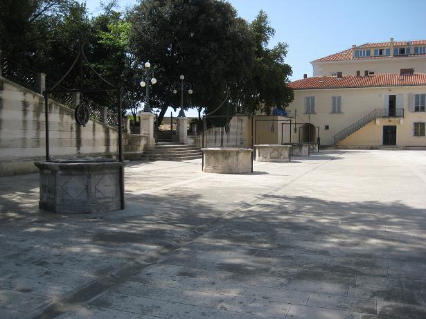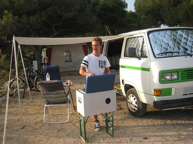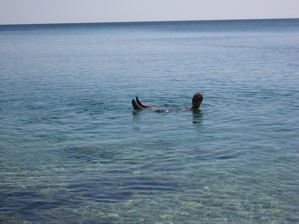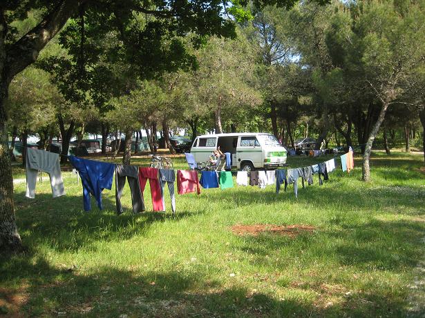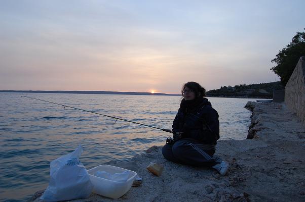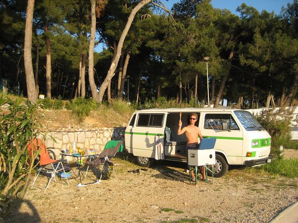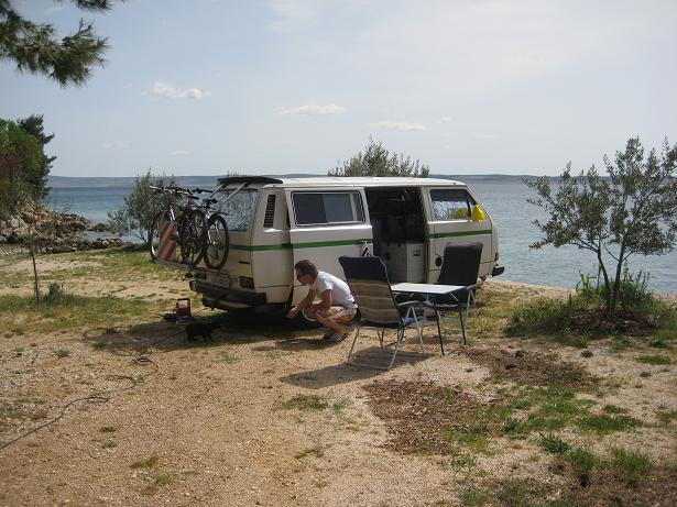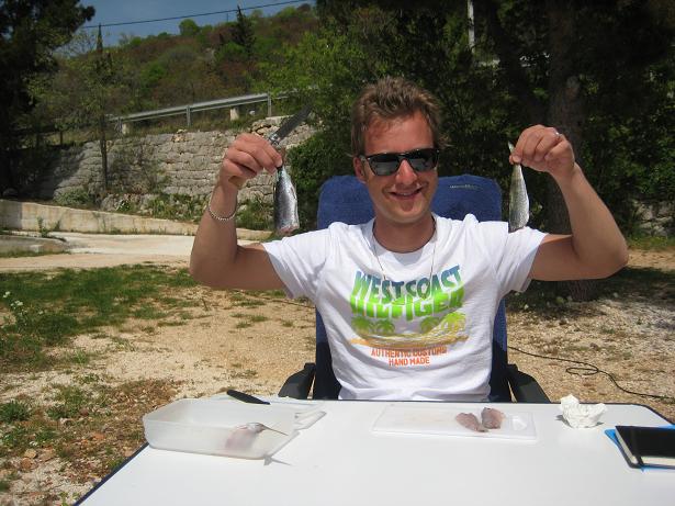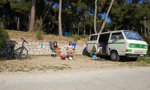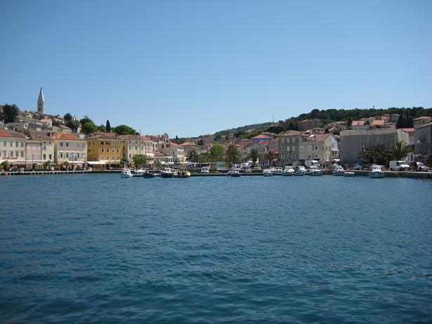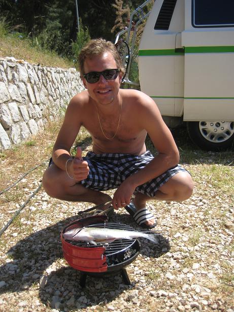 Am ersten Tag, als wir beim Frühstück sassen, kurvte ein Fischer mit seinem Boot durch die Bucht. Mit diesem feilschten wir um zwei frisch gefangenen Fisch. Zum Glück hatten wir den Geldbetrag passend, ansonsten wäre der Fischer gemäss Aussagen eines Deutschen Campers mit dem Restgeld davongefahren. Später fuhren wir mit dem Velo in das ca. zwei Kilometer entfernte Mali Losinj. Den Nachmittag verbrachten wir am Strand mit Plantschen und Ballspielen.