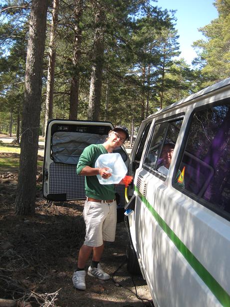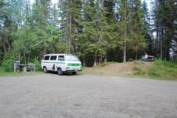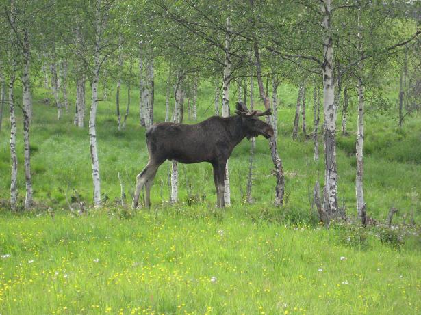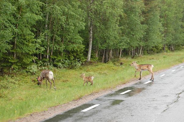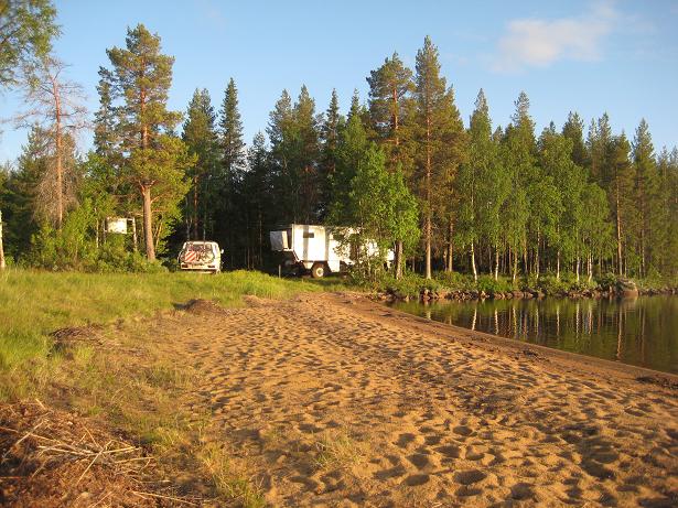 Weiter ging es in Richtung Kristineberg wo wir unterwegs noch einen kleinen Spaziergang am Vindelälv (Fluss) machten. Dort hatte es jedoch so enorm viele Mücken, dass wir es nicht lange aushielten. Bei der Weiterfahrt erspähten wir einen Elch und Rentiere. Auf der Suche nach Trinkwasser klapperten wir einige Badestellen welche im Reisführer standen ab. Nicht immer stimmt die Wirklichkeit mit dem was im Führer steht überrein hatten wir feststellen müssen. Schliesslich konnten wir an einer Tankstelle unsere leeren Flaschen wieder auffüllen. Auf dem Übernachtungsplatz angekommen, trauten wir unseren Augen nicht. Es stand ein riesiger Truck vor uns mit einem Zürcher Nummernschild. Später lernten wir noch die Besitzer Robert und Maria-Christina kennen, mit welchen wir uns sofort gut verstanden. Sie zeigten uns ihr zu Hause auch noch von innen und luden uns sogar zum Nachtessen ein. Die Lachs Spaghetti waren wirklich super fein. Danach wurde noch die Sonne, welche etwa bis um 23:00 Uhr schien, am Feuer genossen und auch als wir nach Mitternacht zu Bett gingen war es noch ziemlich hell draussen.